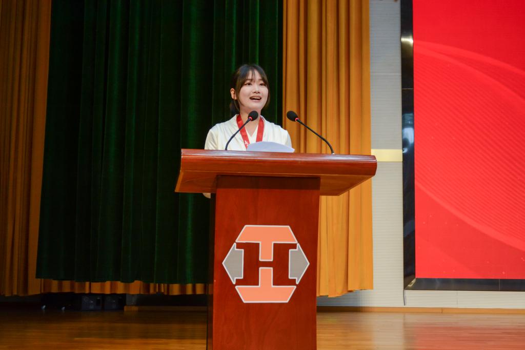 工商管理学院22旅游管理1班优秀毕业生陈钰婷发言,她深情回顾了在校期间参加世界职业院校技能大赛的成长历程。她特别感谢指导教师伍新蕾及其他老师的辛勤付出,从大一时普通话不标准、上台紧张,到后来获得世校赛金奖、全国赛第七名等优异成绩,离不开老师们经常陪练到深夜、一字一句纠正发音、一个动作打磨展示的悉心指导。她表示这份荣誉属于每一个深夜亮灯的实训室和每一句“再来一遍”的坚持,更属于老师们重于泰山的付出,并代表所有获奖同学向老师们致以最诚挚的感谢。